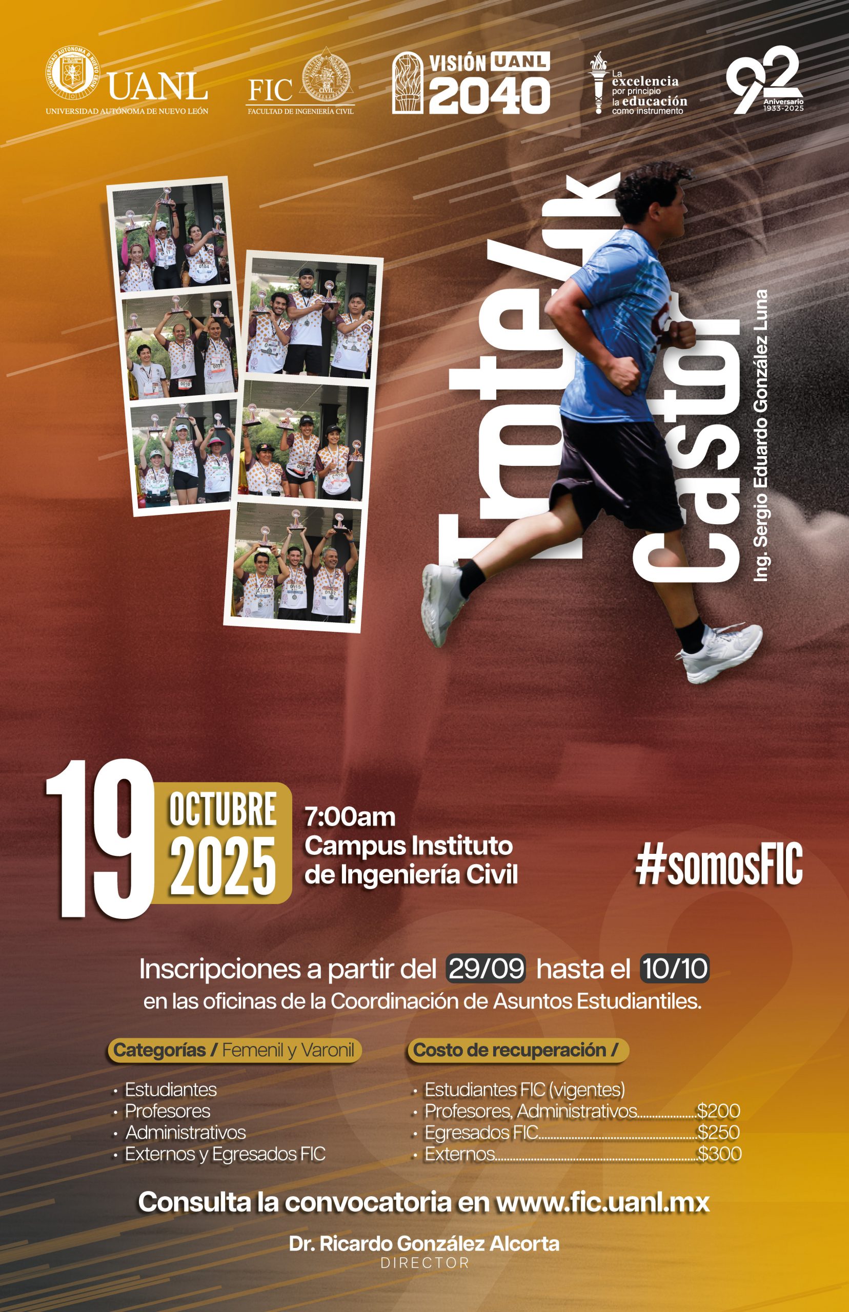 La Facultad de Ingeniería Civil de la Universidad Autónoma de Nuevo León, en el marco de la conmemoración de su 92 aniversario de fundación, tiene el honor de invitar a la Comunidad FIC y al público en general a participar en el Trote Castor 4K “Ing. Sergio E. González Luna”.