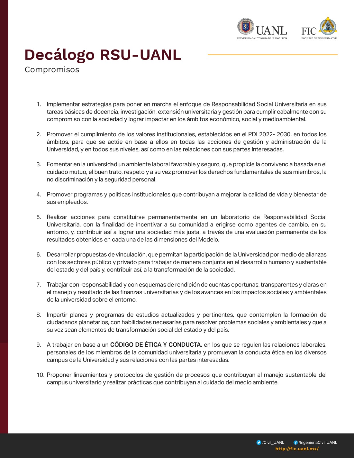 Para cumplir con lo anterior, se ha establecido el Comité de Responsabilidad Social Universitaria, quienes tienen el compromiso de cumplir en cohesión con la FIC cada uno de los lineamientos establecidos por la Universidad Autónoma de Nuevo León. Este comité es el encargado de gestionar actividades, planes y programas para el bienestar de la comunidad estudiantil, docente y no docente de la Facultad, tomando en cuenta los ámbitos de la responsabilidad social, la formación integral y la vinculación e investigación.